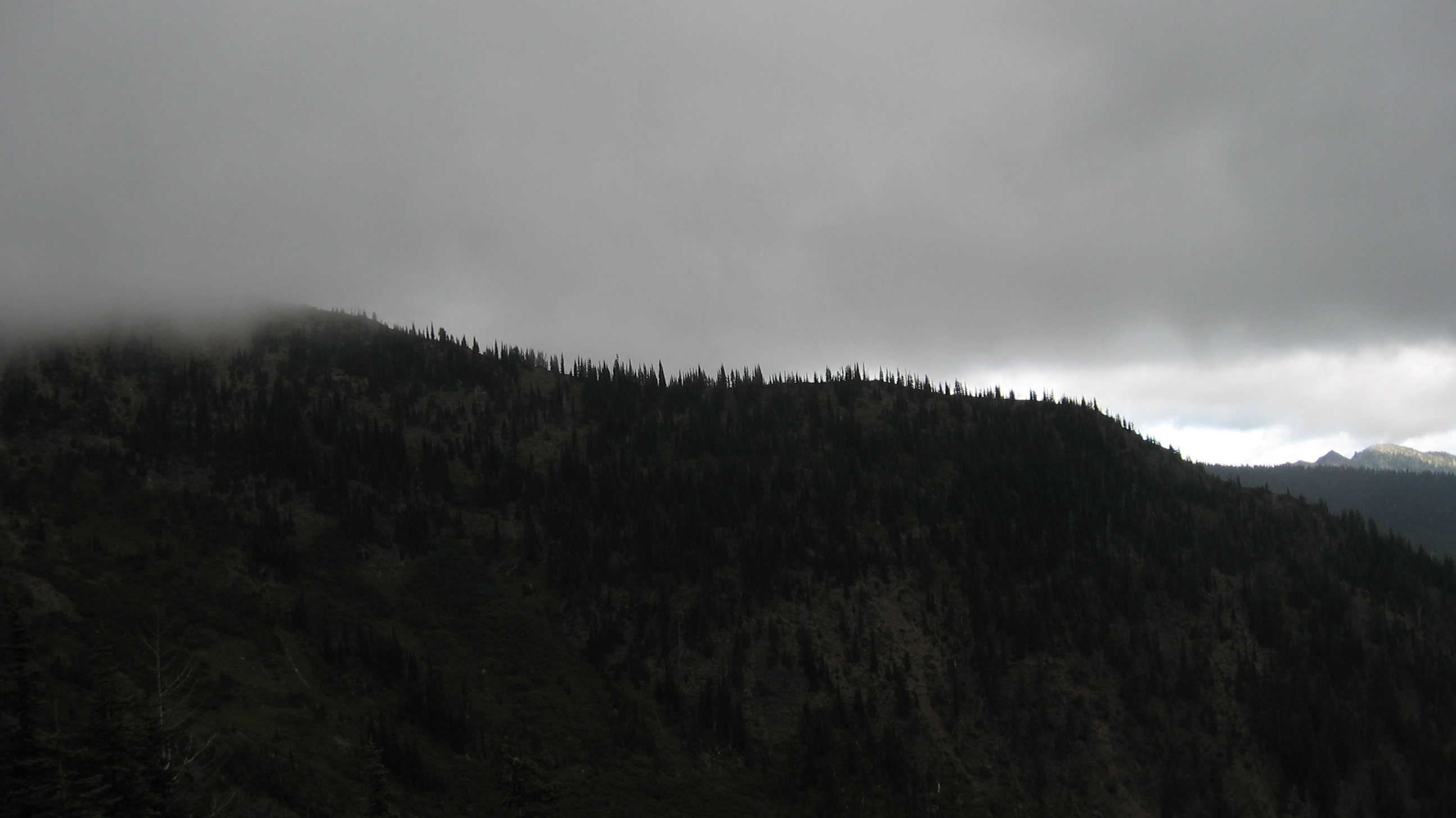 I left Friday morning on the northbound Amtrak Cascades train bound for Everett. With my bus pass, I can ride this train for free to Everett, which was a nice relaxing way to start my trip. At Everett Station, I caught a Community Transit route 270 to Gold Bar. 70 minutes later in Gold Bar, I stocked up on some supplies at the Family Grocer, which is conveniently located at the end of the bus line. Then I headed to the highway to hitch a ride over the pass. I didn't have much luck until I made a cardboard sign: STEVENS PASS PLEASE. With that, I had a ride within a few minutes from a guy who was going rock climbing near Leavenworth. My destination was the Rock Mountain Trailhead, located a few miles east of the pass, and the trailhead conveniently just a stone's throw from the highway. After getting dropped off there, I repacked my stuff, stashed a few heavy items in the trees that I wouldn't need until later, and headed up the trail. This trail is very steep, about 3300' elevation gain in about 4 miles and almost 100 switchbacks. I was few miles short of the transition zone between the wet and dry sides of the mountains; it was cloudy and windy where I was, but I could see clear skies to the east. At about the 6000' level, I was in the fog. My plan was to camp at Rock Lake that night, but it was a bit difficult to locate the lake in the fog. With the help of my GPS, I found the lake and scoped out a nice campsite perched on a shelf above the lake. It wasn't exactly raining, but there was a blowing mist that was dampening every available surface. I made some dinner as dusk fell, and then searched for a sheltered spot to sleep. I stayed relatively dry and comfortable in my bivy sack tucked under a small lean-to I made with a small tarp.